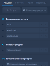 Открывается вкладка, в которой присутствуют уже накопленные ресурсы. Ресурсы делятся на группы: «вещественные», «полевые», «временные» и «пространственные».