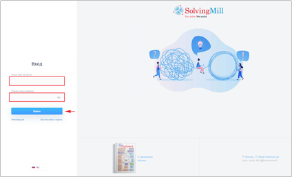 Для входа в личный аккаунт пользователя Solving Mill на главной странице необходимо ввести свои адрес электронной почты и пароль в соответствующие поля и нажать кнопку «Войти».