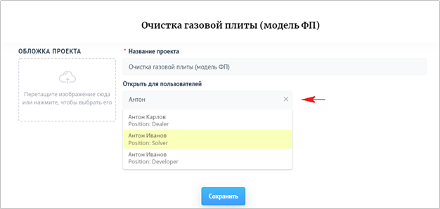 При вводе данных появится выпадающий список, где отобразятся пользователи, соответствующие запросу.