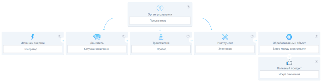 В результате совместной деятельности частей системы получается полезный продукт искра зажигания. Здесь наблюдается только одно превращение энергии от источника до рабочего органа. В двигателе, катушке зажигания, напряжение аккумулятора превращается в высоковольтный импульс. Превращений в трансмиссии нет, следовательно, полезная система элементарная.