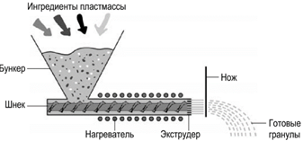 Для получения пластмассы в бункер подаются ингредиенты четырех типов. Это три компонента, образующие пластмассу, и катализатор. Размеры и плотность ингредиентов разные. Внизу бункера установлен шнек, который перемешивает ингредиенты и подает их в зону нагрева, где происходит плавление и термохимическая реакция. Образуется расплав готовой пластмассы. Расплав проходит через отверстия экструдера и нарезается вращающимся ножом на гранулы диаметром 3 мм и длиной 10 мм.