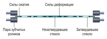 Любое нагретое тело, в том числе и полоса стекла, остывает неравномерно. Сначала остывают краевые участки полосы, а середина дольше остается горячей и мягкой. Из-за этого стеклянная полоса претерпевает сложные внутренние деформации, в том числе и расширение. А ролики препятствуют этому расширению.