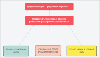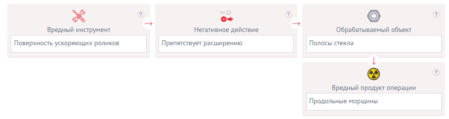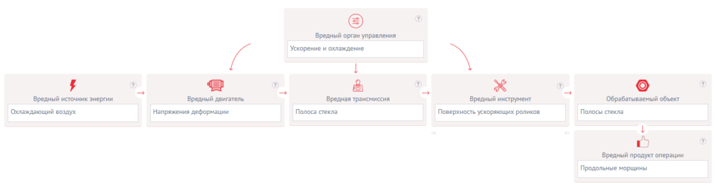Обрабатываемый объект — полоса стекла. Вредный инструмент — поверхность ускоряющих роликов. Вредным двигателем являются напряжения деформации полосы стекла при затвердевании. Эти силы передаются к инструменту через саму стеклянную полосу (трансмиссия). Вредный источник энергии» — охлаждающий воздух. Управляют работой системы совместные действия: ускорение стекла роликами и его охлаждение.