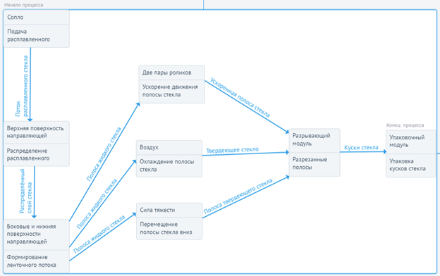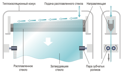Жидкое стекло через сопло подаётся на направляющую, растекается по ней, образует ленточный поток и стекает вниз, постепенно застывая. Далее зубчатые ролики ускоряют движение формируемой полосы стекла. Каждая пара роликов приводится электромотором через редуктор.