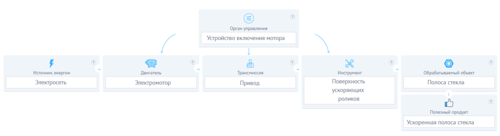 Инструмент, который движет полосу стекла вниз — это поверхность ускоряющих роликов. Ролики приводятся в действие электромотором (двигатель), энергия от которого передаётся приводом. Энергия в систему поступает от электросети, а управляется система устройством для включения мотора.